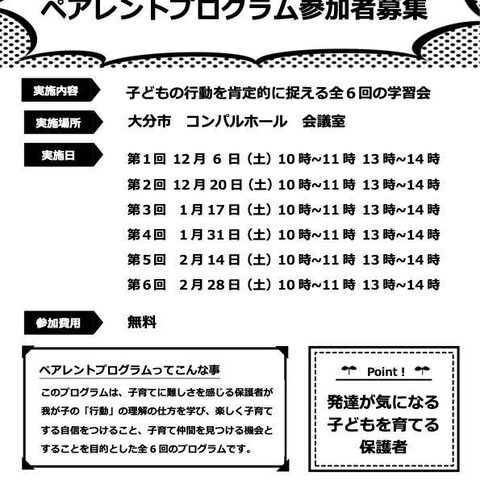 - 大分県から委託を受けているこどもへの関わり方を学ぶ、ペアレントプログラムについて開催します。第一回:12月6日 10時〜...